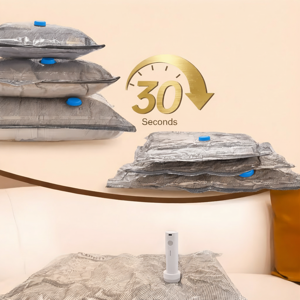Tired of cluttered closets or overstuffed suitcases? Our Pack Em Up Vacuum Pump makes it easy to compress clothes, blankets, and bedding, giving you up to 75% of your space back while keeping your items neat, clean, and protected.